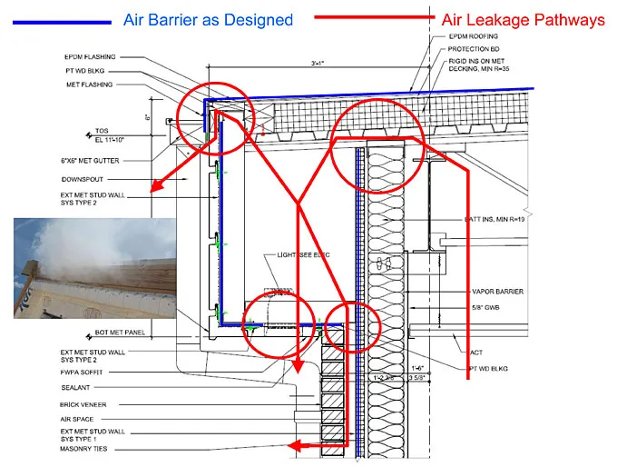 This elementary school assembly could have been air-sealed at the top of the wall, simplifying the assembly and providing air-barrier continuity. BECx would have found a mistake like this early; instead, the problems were discovered when the building failed its air-leakage test. When a fogger was used to identify where the building was leaking, fog was seen leaving the building through all the pathways shown here.