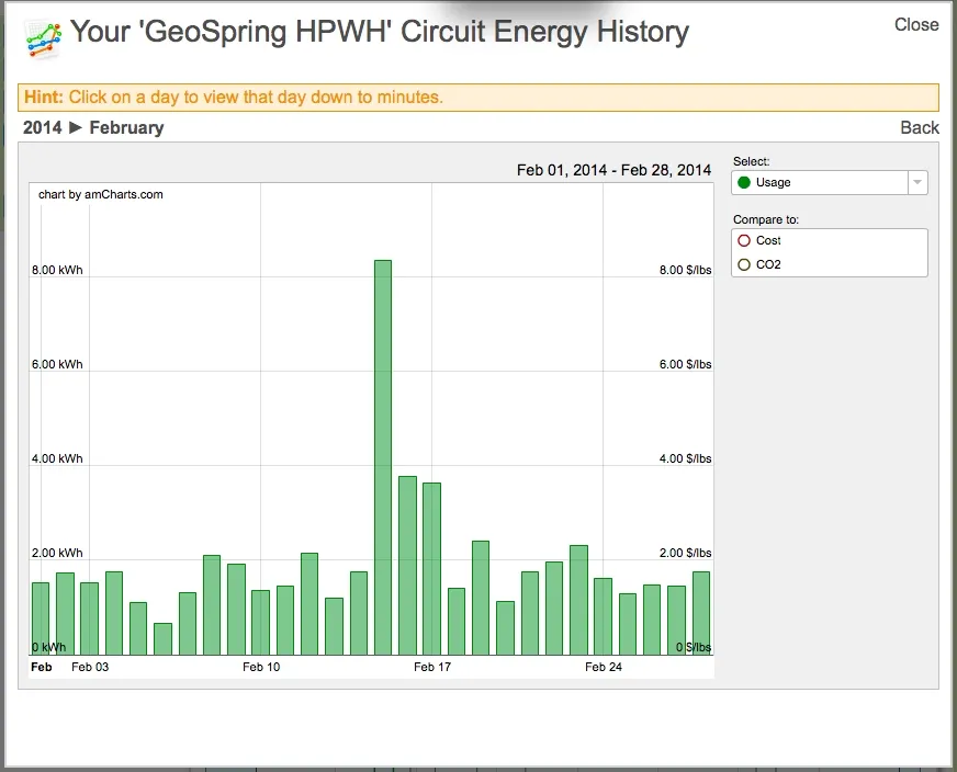 Electricity consumption by our GeoSpring heat pump water heater in February. Note the spike mid-month when I switched the mode to "boost." Click to enlarge.