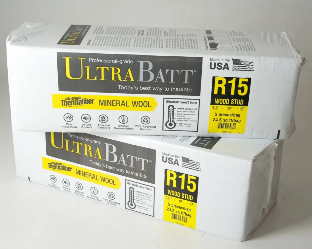 UltraBatt is a fairly dense batt (not compressible like fiberglass batts) that offers very good sound control as well as relatively high insulating values. The 3-1/2” batts for 2x4 walls provide R-15, and the 5-1/2” batts for 2x6 walls provide R-23—though, as with all cavity-fill insulation, that actual “whole-wall” R-value will be lower, due to thermal bridging through the studs.