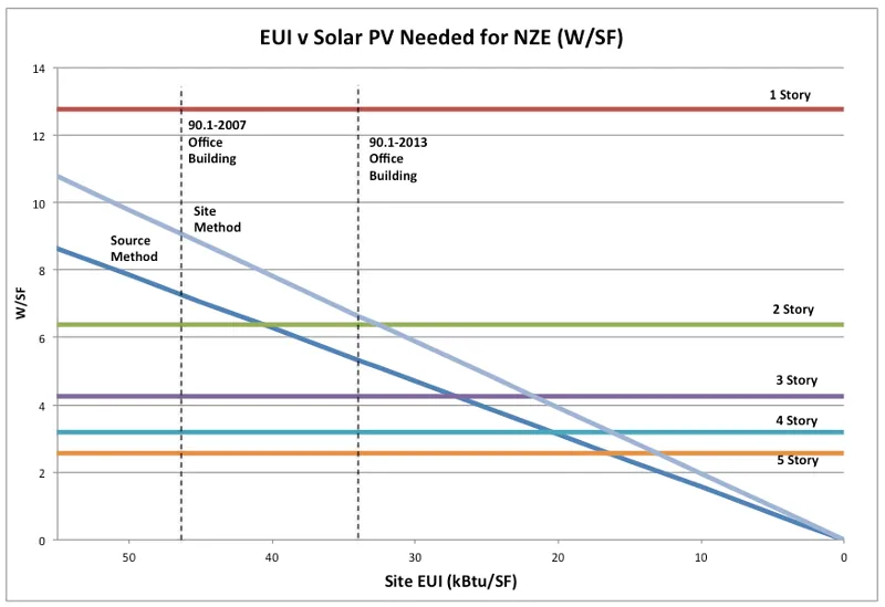 The chart shows two diagonal lines, one each representing a way to calculate NZE: source versus site. The “Source” method is based on the new Department of Energy (DOE) definition of NZE (which it refers to as Zero Energy Buildings, or ZEB), which essentially says to separately determine the source energy use of natural gas and electricity (and any other fuels used onsite fuels), and to offset this usage using onsite renewables. Source energy factors in the energy used to make and transport the energy you use; in the case of natural gas, it takes 1.09 units in source energy to deliver one unit of gas. The “Site” method, by contrast, only looks at site energy usage, and the PV offsets the amount of site energy that it produces with no source energy factors.