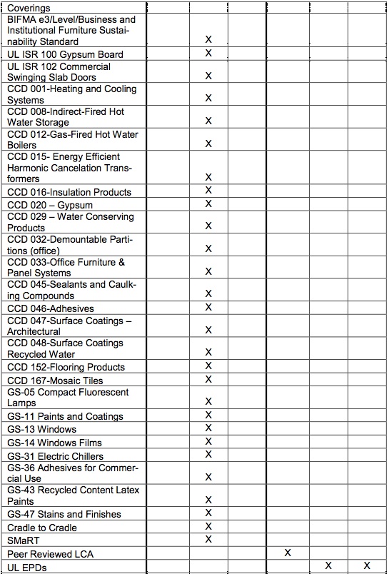 The LEED Standard for Standards document is planned to be a tool for decision-making in evaluation of certifications, labels, and standards included in LEED. While the minimum criteria are being developed a list of pre-approved certifications is provided in the Appendix. If a certification does not appear on this list but should be considered for the Certified Products Pilot Credit please e-mail the suggestion to pilot@usgbc.org.