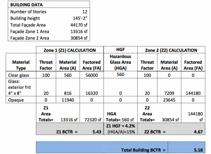[((Material Type 1 Threat Factor) x (Material Type Area)) + ((Material Type 2 Threat Factor) x (Material Type Area))...] / [Total Facade Zone Area] = Facade Zone BCTR [(100 x 0) + (20 x 7209) + (0 x 23645)] / 30854 = 4.67 (Facade Zone 2 BCTR)