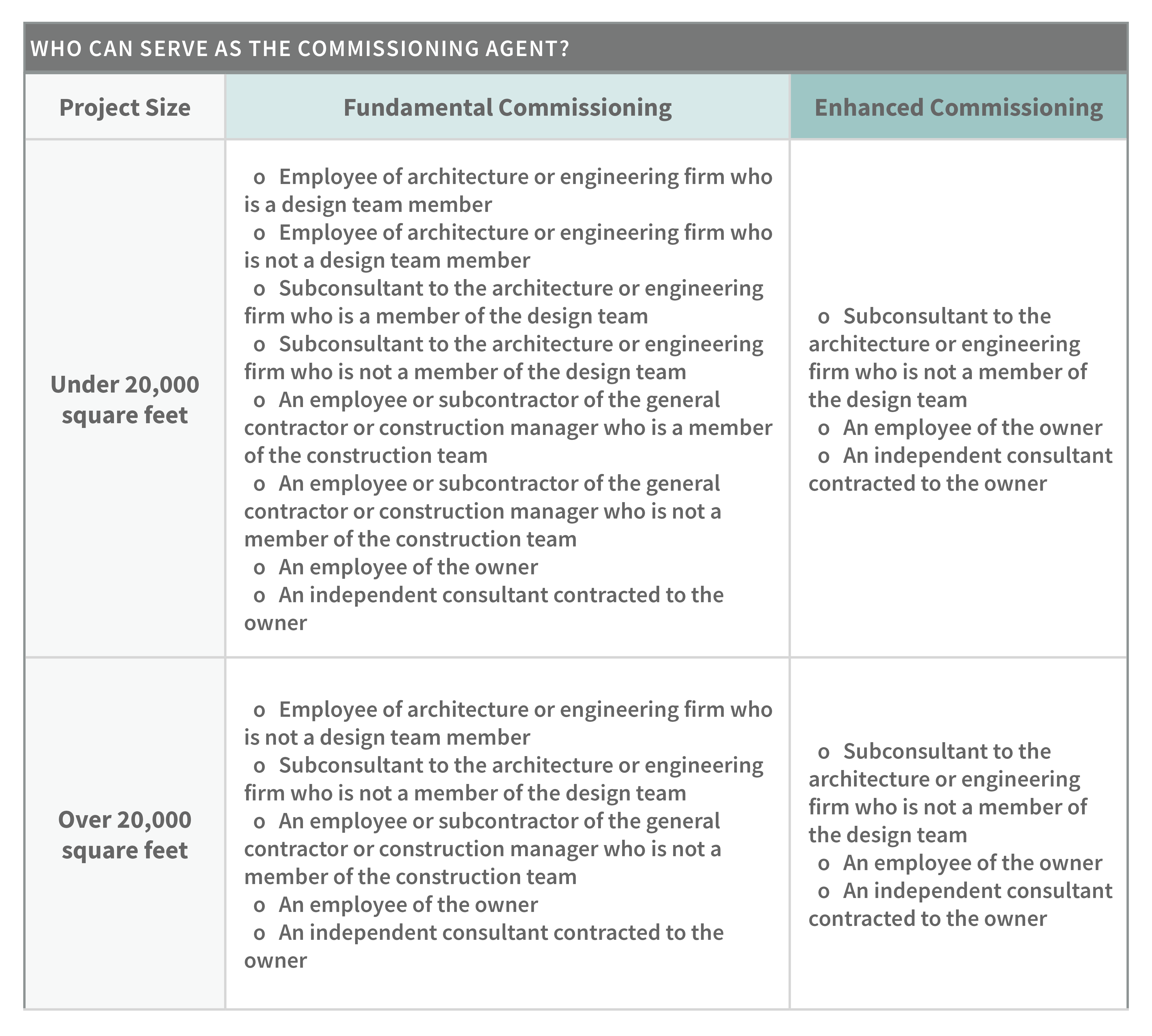 - The credit has been revised so that commissioning agents may now be employees of the design or construction firm, provided they are a disinterested, non-member of the design or construction team.