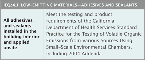 It shouldn’t cost you anything to earn this credit—it will just take a little work (the same is true for the related credit, IEQc4.2: Low-Emitting Materials—Paints and Coatings). Your first priority should be to specify only adhesives and sealants that comply with the credit’s VOC limits, and enforce those specifications on the jobsite.