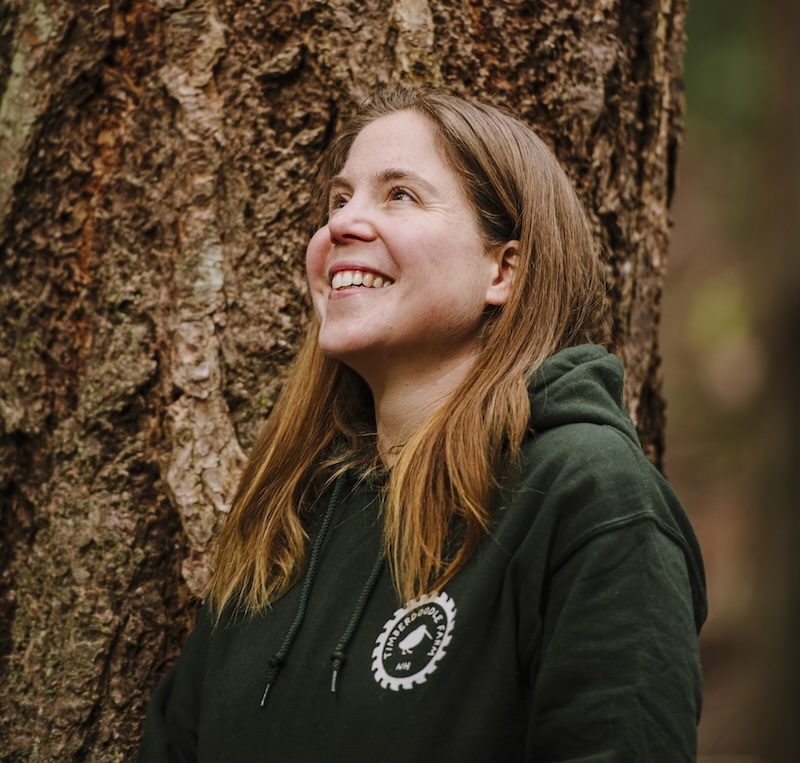 Katrina is a logger, sawyer, and ecological consultant. She applies her background in wildlife biology and land conservation in support of local woodsheds that center regenerative timber harvests and thriving small business ecosystems. Katrina trials a lot of potential solutions via Timberdoodle Farm, the business she runs with her husband.