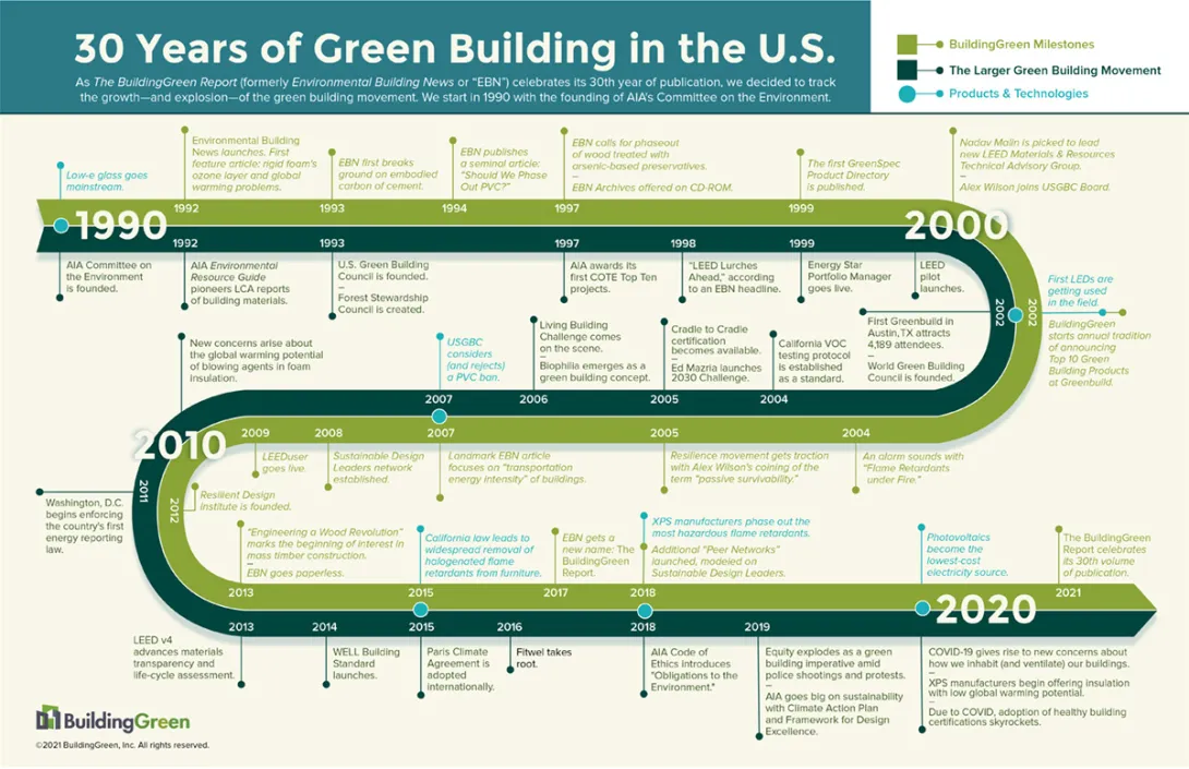 It has been quite a wild ride! As The BuildingGreen Report (formerly Environmental Building News) celebrates its 30th year of publication, we decided to track the growth—and explosion—of the green building movement. We start in 1990 with the founding of AIA’s Committee on the Environment.