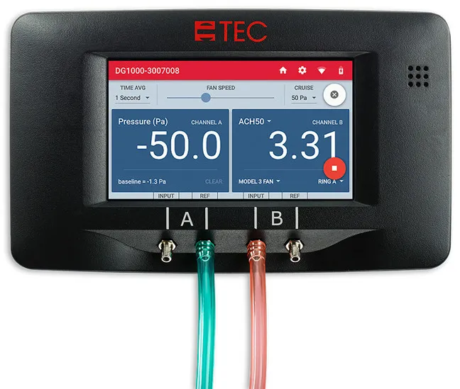 But recently I got to work with a brand spanking new TEC blower door kit that included the DG1000 digital pressure and air flow gauge, and here are the features that sold me: