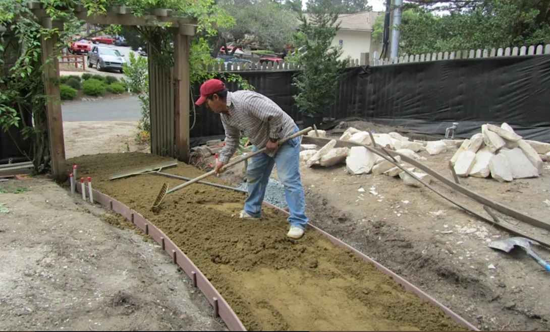 GraniteCrete was developed some 17 years ago by Geoff Smith. After years of testing and refinement over hundreds of installations, Smith patented his process in 2006 and really launched a serious business in 2008. Smith, who is president of the company, told me that nearly all installations have been done in California, most in coastal areas where freeze-thaw is not a concern. During installation, the dry-mix material, which is sold in bags and referred to as either an aggregate binder or aggregate admixture, is mixed at a 1:11 ratio with decomposed granite aggregate (a pre-consumer recycled waste material from granite quarrying and processing) that can be either 1/2" minus (material that passes through a 1/2" screen) or 3/8" minus. A small amount of water is added, creating a moist but not-flowing mix that is spread on the area being paved, raked even, and power-tamped. A key advantage during installation is that you can walk on it during installation. Full strength is reached after 28 days.