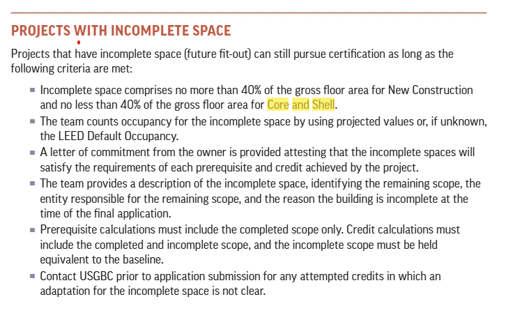 Hi Kate, OK this view is very helpful to see. I think I understand what you're asking now. I thought you wanted current-phase spaces to benefit from borrowed light through the shell spaces separated by opaque temporary partitions, a tough question. Now I see you're asking if you should include and model the shell spaces as being daylit through clear or absent partitions as it will be in the final. I usually exclude shell spaces, but my experience has been with smaller portions that what you show. I basically sorted them as "unoccupied" for all EQ credits, so they wouldn't appear in regularly- or non-regularly occupied areas. In this case, I think it makes sense to ask to include the entire shell as "regularly occupied" category, constructed as they will be in the final. As such they don't hurt the daylight or views of any reg occ spaces I can see. In the distant past I used to exclude a circulation area around the core, so I know what you mean there, can't find a reference to that practice, however. According to credit language from v4, for Core and Shell: "Assume that the entire floor plate, except for the core, will be regularly occupied space." Seems reasonable to follow that for the shell spaces here.In v5 ref guide there is the following guidance for incomplete spaces. My colleagues say that ultimately you have to work it out with USGBC in writing, since each project is different. See image below. Best of luck! - Collin